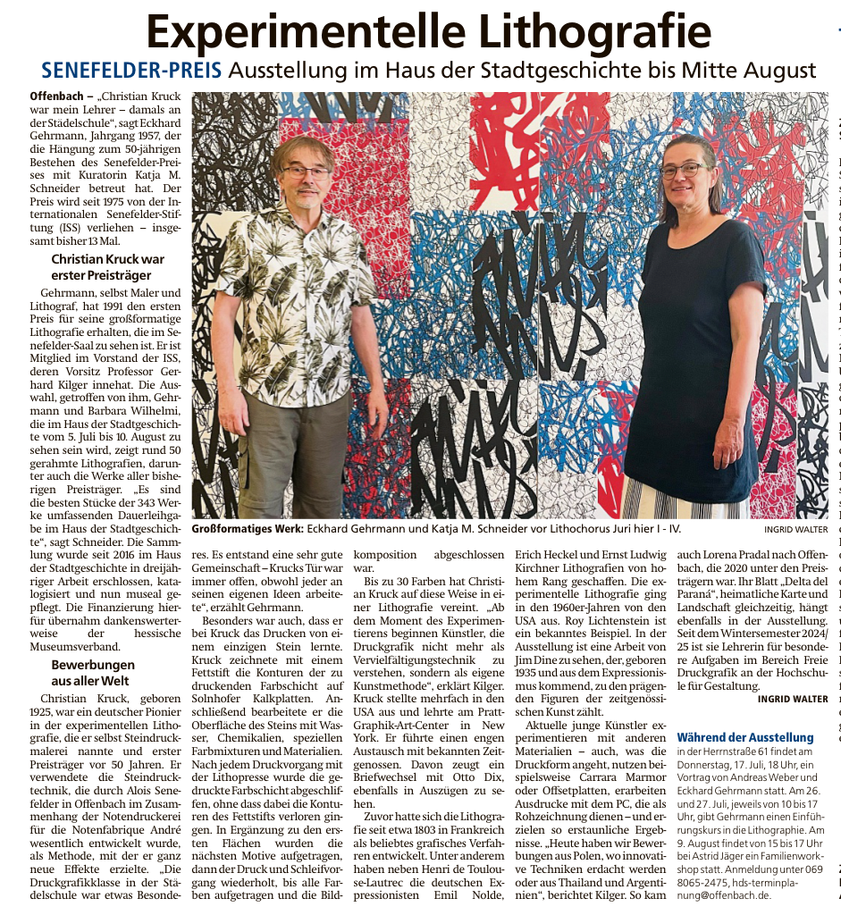 Vor 50 Jahren wurde der erste Internationale Senefelderpreis vergeben. Zu diesem Jubiläum werden im Sommer einige der wichtigsten Lithographien aus den Jahren von damals bis heute im Haus der Stadtgeschichte in Offenbach ausgestellt. Diese Auswahl geht besonders auf den damals ersten Preisträger, Christian Kruck zurück, der mit seiner selbst entwickelten Technik der „Steindruckmalerei“ den Beginn der experimentellen künstlerischen Lithographie geschaffen hat.